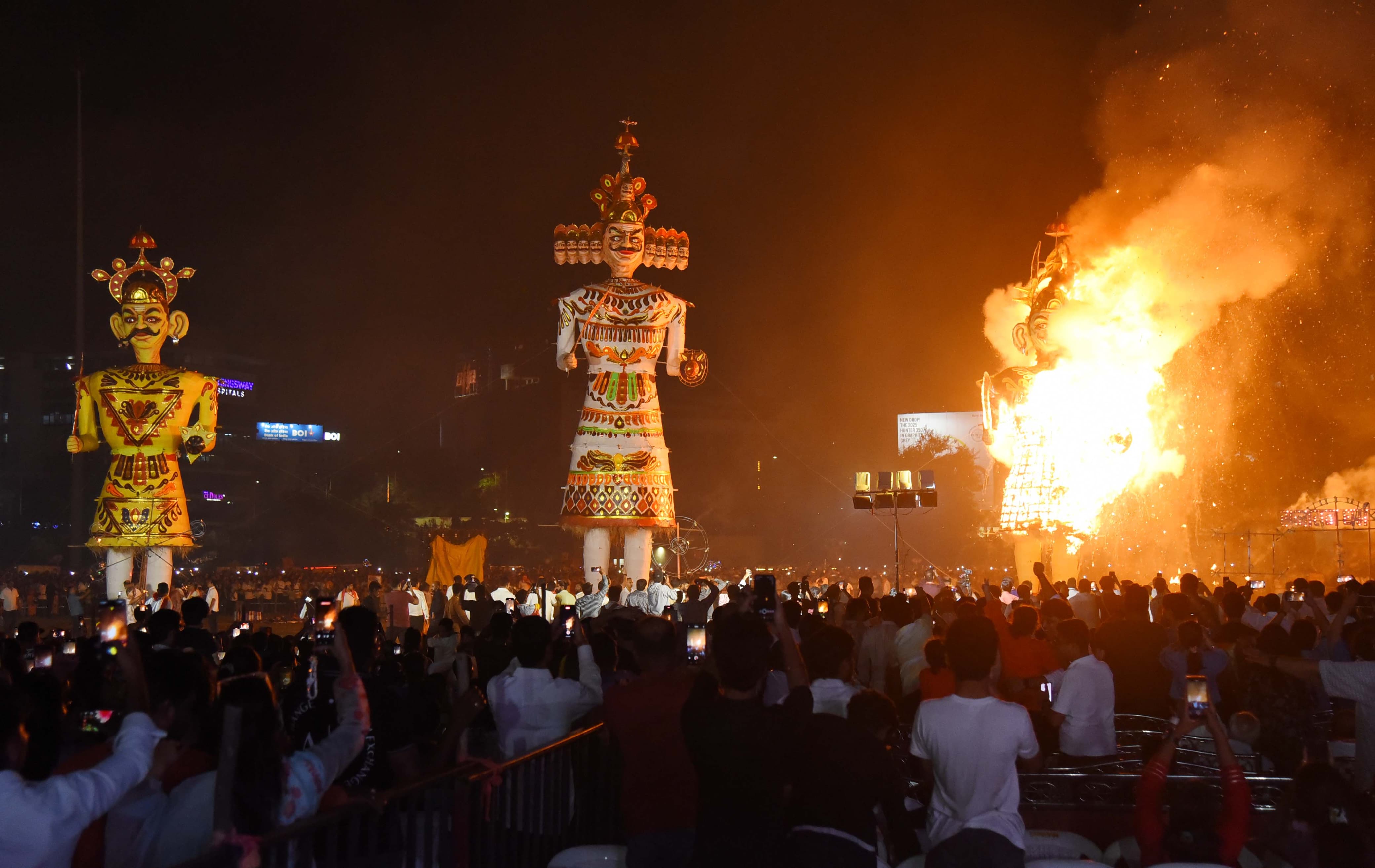Nagpur : Crowds gathered at the Dahan (burning) ceremony of Ravana, Kumbhakarna and Meghnath at KP Ground in Nagpur