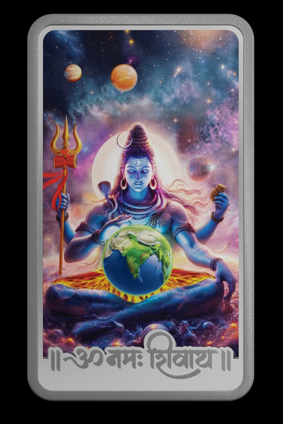 This silver bar is a spiritual masterpiece, a visual embodiment of Lord Shiva’s cosmic power, serenity, and divine guardianship. Crafted with the Finest Swiss Craftmanship blended with India’s rich artistic heritage, the front side of the bar showcases Lord Shiva seated in a meditative pose amid a celestial backdrop. His aura radiates calm strength as he cradles the planet Earth in his hand, symbolizing his role as the protector and creator of balance in the universe. Surrounding him are cosmic elements like galaxies, planets, sacred symbols such as the Trishul and Damru, and intricately designed motifs representing the boundless energy of Shiva.